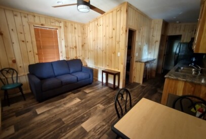 The Pool Side Cabin has two bedrooms and a full bath. The kitchen has a cooktop, dishes, and cooking utensils. It also has a living area that overlooks a deck to the great outdoors. All you need to bring is your own bedding and towels. Your pool side vacation cabin is heated and air conditioned.