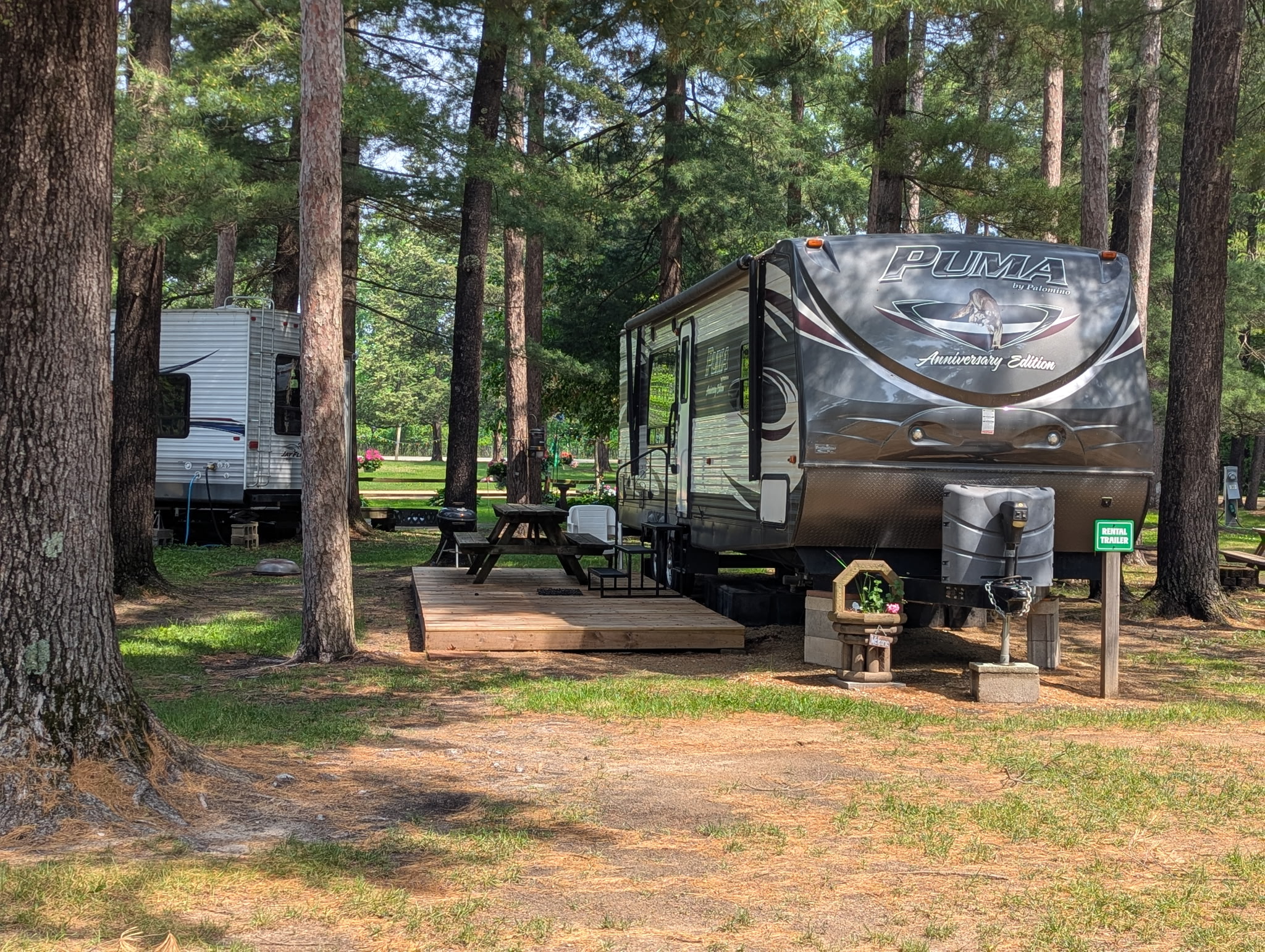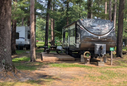 Our 33ft travel trailer has a queen bed in the bedroom. The trailer has a large slide out for the dinette and a couch that converts to a full bed. It has a full bath with a shower. The kitchen is stocked with dishes and cooking utensils. All you need to bring is your own bedding and towels. The travel trailer is heated and air conditioned.